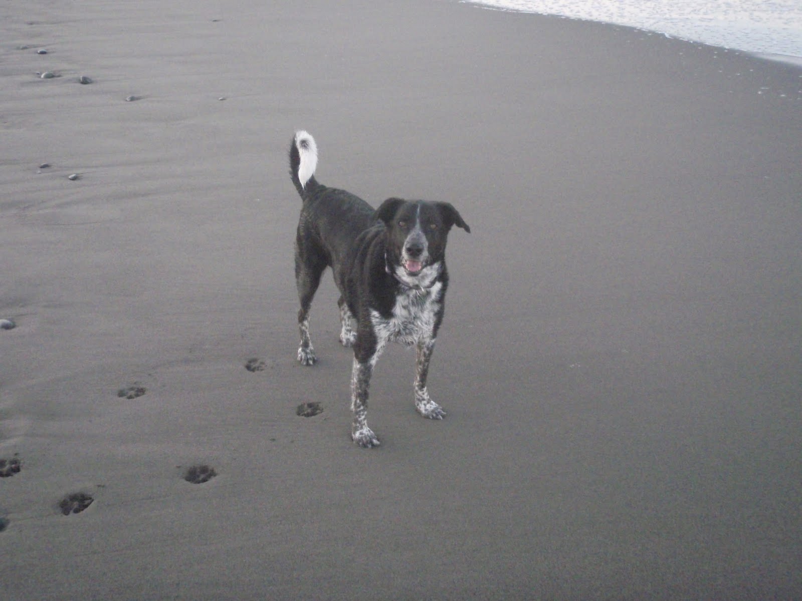 zero has learned to read waves and Snowflake stands upright and jumps over them