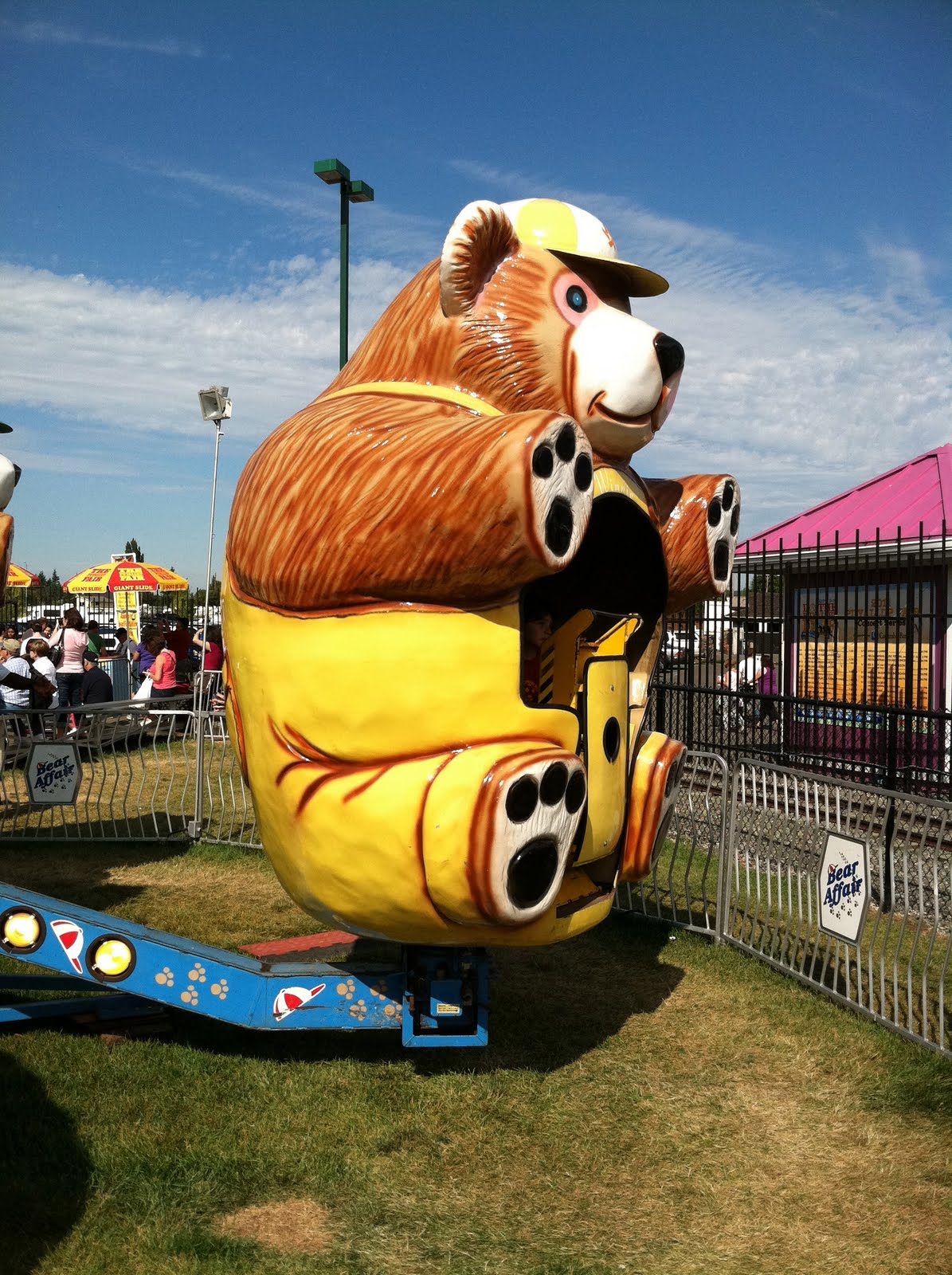 the real mother ship~ the crowning jewel of the state fair circuit / at least to me / so fancy / so perfect and unlike all the other schlocky airbrush painted crap~each panel is a work of art/ a landscape to some idyllic mountains, river valley, pasture landed dream, an advertisement for nothing but itself/ applied to surface onto which no eye falls/ the direction of the ride is out to the crowds head/ the other rides / the sky / the hills/ and hillbillies